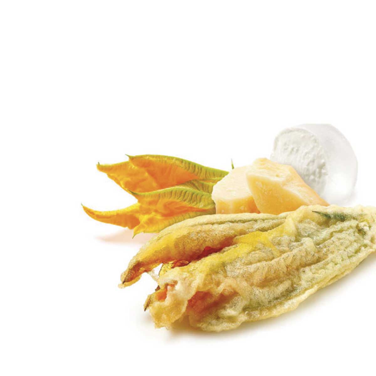 Prepared using only fresh zucchini flowers, grown in the Agro pontino, are wrapped in a soft fried batter
